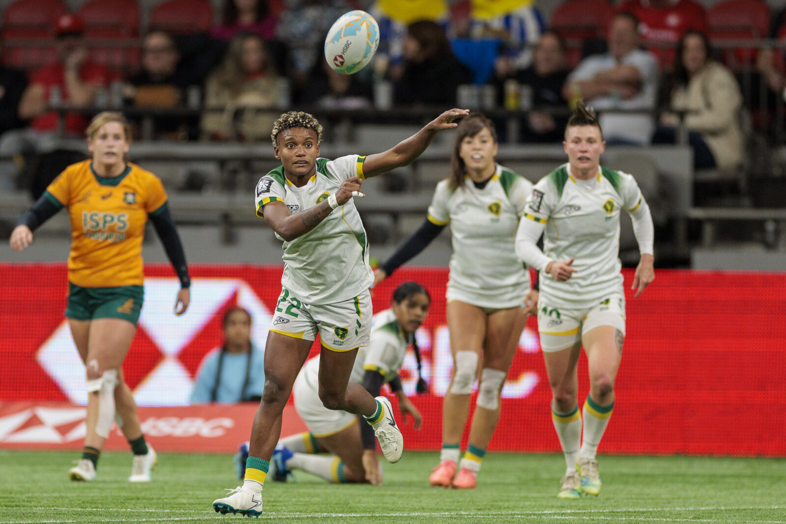 No segundo embate do dia, o Brasil encarou a Austrália, em jogo que tinha, no papel, o favoritismo do lado australiano, campeão do Circuito Mundial em 2024. Porém, as Yaras fizeram história. Teagan Levi e Faith Nathan marcaram os dois primeiros tries do jogo para as australianas, que foram ao intervalo vencendo por 12 a 0. No entanto, o segundo tempo foi brasileiro e teve Yasmim brilhando com dois tries para uma incrível virada – o segundo e decisivo em ação orquestrada com Thalia Costa. No último lance, Thalia aplicou um tackle salvador que impedia aquele que parecia try certo da Austrália. Festa brasileira com 14 a 12 emocionantes.