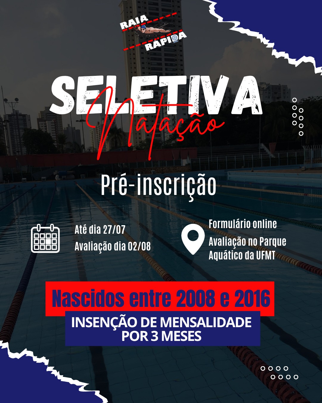 Estão abertas as inscrições para a seletiva de novos atletas do projeto Raia Rápida – UFMT, iniciativa da Faculdade de Educação Física da Universidade Federal de Mato Grosso (UFMT), Câmpus de Cuiabá. A seletiva é voltada exclusivamente para atletas que já possuem habilidade de nado, e nascidos entre 2008 (17 anos) e 2016 (09 anos) e não contempla vagas para iniciação ou adaptação à natação.